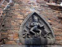 | A sculpture of the goddess as Mahishasuramardini is on the pediment above the entrance to the temple: it depicts the four-armed goddess holding a hatchet, a lotus and a club, and standing on a buffalo. This sculpture belongs to the Tra Kieu style of Cham art from the end of the 10th century or the beginning of the 11th century AD. | ||||
