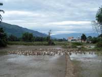 | A pause for a cup of tea, where the pot was kept warm in a coconut shell. On past rice paddies, ducks and water buffalo to the beach and the zodiacs. | ||||