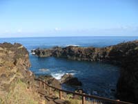 Steps down to the cave called .. | ..Ana Kai Tangata which had .. | .. petroglyphs on the walls and .. | ..the lava field around |