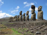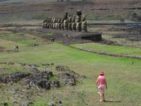 Toppled moai were a much more common sight than standing statues until we got to Ahu Tongariki. It has been restored and has fifteen, now standing, moai including an 86 tonne moai that was the heaviest ever erected on the island. All the moai here face sunset during Summer Solstice. In 1960, further damage was done to the then toppled moai here when a massive tidal wave, generated by an earthquake off the coast of Chile, hit Ahu Tongariki and destroyed the platform and swept the massive moai hundreds of yards inland. In 1992 a team from Japan brought in cranes and other heavy equipment to restore Ahu Tongariki. Working under the direction of Chilean archaeologist, Claudio Cristino, the task took five years. Now all 15 of the moai stand once more at what is for me Easter Island's most impressive site.