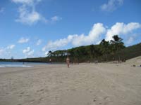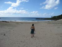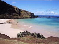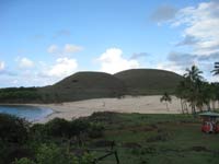 After this one reaches the only two sandy beaches on the island: Ovahe, quite small, and the sea was too rough to swim when we were there, and finally Anakena, which is believed to be the initial landing place of the Polynesians who arrived at the island. You come here today both for the impressive sheltered sandy beach and for the restored ahu, of six statues, some of which include top knots. Anakena has been the site of several archaeological digs including those of Katherine Routledge in 1914 and of both William Mulloy and Thor Heyerdahl in the 1950s.