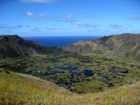 Rano Kau is a 1000 ft tall extinct volcano that forms the southwestern headland of Easter Island, a Chilean island in the Pacific Ocean. It is one of the three volcanoes that make up Easter Island. It was formed of basaltic lava flows many thousands of years ago. Rano Kau has a crater lake. The crater is almost a mile across and has its own micro climate. Sheltered from the winds that dry most of the rest of the island, figs and vines flourish at Rano Kau.