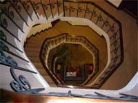 | The hotel was on the very narrow street above, and looked out over the city. A spiral stair wound up inside the building. | |||