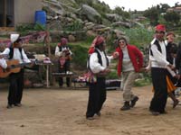 Our boat trip then ventured out further onto the lake for another couple of hours to get to the island of Taquile. On Taquile we had lunch and watched "traditional" dancing. Inevitably it is a bit of a tourist mill, and there is certainly no spontaneity in what the indian natives are doing. Isla Taquile is a normal, non-floating, island in the Peruvian side of Lake Titicaca. Tourism is they say strictly controlled by the island elders to maintain the island's culture - I had my doubts about this..