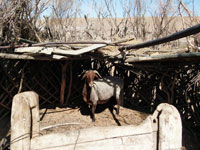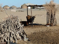 In the evening time the flock of those, who did not send sheep further away, start consuming water from sardob. The richer people have pumps, poorer do not. During our stay it was also the time to prepare the yurt for the winter. Usually they do it twice a year (autumn and spring). This job is done by women only. In the morning they put off thick felt, felt mat, doors and ropes. Then they adjusted tackles and tied up the bundles. There are also chicken and dogs – taza – in Damla. Dogs are used in the hunting for rabbits. Hunters dazzle rabbits and let the dog chase them.