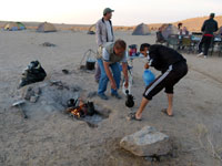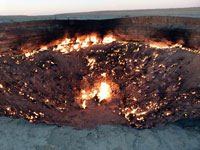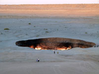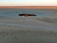 On the way to the gas crater, we also visited the ( best forgotten) two other craters billed as "tourisi", one filled with hot black water and the other with mud geysers. The water one looked particularly sad, with the surface nearly all covered with empty floating plastic bottles. Towards dusk, we camped in the shelter of the sand dunes close to the gas crater and enjoyed the experience of seeing it at both sunset and sunrise The Gas Crater was truly worth the journey. It did look like the gates of hell - 70 metres across, and all of it alight, an overpowering heat on the downwind side, a slightly sulphurous tang to the air, and incredible flames through the whole crater. They must be burning off hundreds of thousands of dollars worth of gas every day.