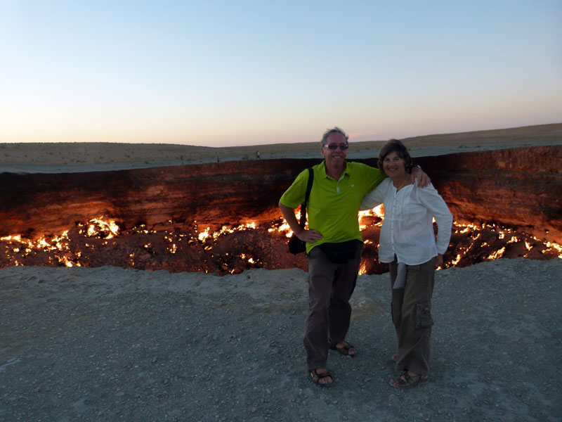 After lunch in Ashgabat, we joined up with our 4*4s to make the 4-hour drive to Darvaza, one of the more bizarre "100 places to visit before you die". Set in an unforgiving and bleak desert environment, the Darvaza gas crater is, they say, like looking down into the bowels of hell. The crater is 260 km north of Ashgabat on a reasonably good road, after which one turns off for 7 km on a compacted sand road over some dunes. The temperature reaches over 40C in mid-afternoon and then gradually cools, We traveled 3 punters to a jeep, plus driver. Our driver was a particularly dour Russian, who sparked not one grain of humanity. Never spoke a word to us over 3 days.