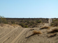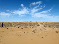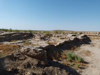We drove on towards Gonur Depe, which is about 60 km north of Mary. Roads at first were entirely sand, some of it loose, with the occasional vehicle getting bogged down in the sand - later there was the old Russian road, which was un-maintained, and progress was slower than on sand, as the jeeps had to weave to avoid the large and frequent potholes. There was a lunch stop at what looked like an abandoned building, but may well have been inhabited. The nearby electricity sub-station was another of the things that we were not allowed to photograph. Turkmenistan is full of prohibitions that I could never understand - it seemed safer to ask before one took a photo of anything or anyone. We motored on and reached Gonur Depe in mid afternoon.