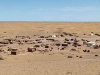 Derweze (Persian:The Gate, also known as Darvaza) was a village of about 350 inhabitants, located in the middle of the Karakum Desert, 260 km north of Ashgabat. Darvaza inhabitants were mostly Turkmen of the Teke tribe, preserving a semi-nomadic lifestyle. In 2004 the President of Turkmenistan, Saparmurat Niyazov, drove by, did not like what he saw, and ordered the complete destruction of the village because "it was an unpleasant sight for tourists."
