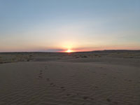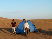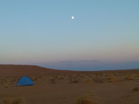 On we went across the desert, all without a soul or an animal, until we reached another desert village, Ak-Molla, and set up camp a few kms from the village. Here watched the sun go down and the moon go up, before being driven into the village for dinner. Our convoy obviously brought their own food with them - only way to get food here! That night we had spaghetti, cooked by the ground company owner - long tale I never got to the bottom of, but the expedition cook disappeared halfway across the desert, in order to go back home.