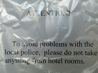 The hotel was described by Jake as "charmless", I think this was a more flattering description than I would have given. I never quite cracked where the hotel actually was, apart from being a long way from Mary. This odd notice was the only thing in English that I saw, and appears to be indicative of some rough guests from foreign parts staying here. Our room was actually very spacious, but as is the way in Turkmenistan, there is no maintenance and very few things work. The curtains were too small for the windows, the carpets were moth eaten and torn, a water fountain was installed in the room, but did not work, there was no hot water in the bathroom over the 2 days we were there, the room was not serviced even once, most of the lights did not work, and so on. We also enjoyed a forgettable dinner and 2 breakfasts in this hotel. For the second breakfast, they actually ran out of food: we suspected a large Korean group had earlier eaten the hotel out of house and home.