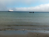 The unslinging of the Zodiacs was a fairly slick operation .. | ..the Expedition staff were soon heading to recce the beach .. | ..and in the flat calm there were no difficulties in the wet landing. | A few of the locals were there to greet us. Most were friendly .. |