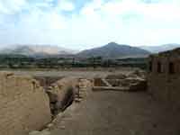 The site consists of several structures around a large central plaza. The central plaza is shaped like a trapezoid with its largest side being 150 m long. The main structures are grouped together in a northern part and a southern part (Sector Norte and Sector Sur). These structures are known as the Northern palace and the two Southern Palaces, flanked by an Ushnu (raised ceremonial platform) and a building known as the Utilities Structure.