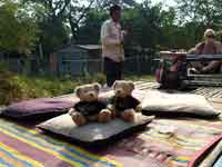 It is a long road trip from Siem Reap. and we had booked a boat to take us, but insufficient water levels ruled that out, and by car it was. Two "stretch legs" stops: one to see Buddha stone carving and a second to see them selling barbecued rats and beetles - yes, that is the form of roadside stack much loved by Cambodians, and we were also to see it later in Laos.