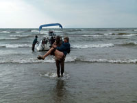 For the trip back, the manager arrange for one of the staff to carry Chris ashore