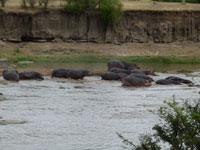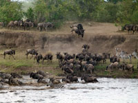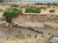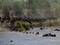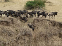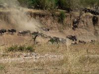 To see the Great River Crossing, you need to aim for the Northern Serengeti in August or early September . I had thought that it was effectively one big herd of wildebeests, but in fact it is maybe hundreds of herds, each with some thousands of animals. The trick is to see the herd gathering, then sit and wait for it to take courage and swim across the Mara River. The migration is in both directions at the same time, and we saw herds going east one day, and crossing west the next. Observing the group dynamics is quite fascinating. Once one or two leaders have made the decision to jump into the water, the rest very quickly stampede to follow. But any sudden disturbance during a crossing, and the tail end ones will turn and flee back into the bush, from whence it may take them a couple of hours to emerge, and try again. We saw 6 river crossing - that is 2 a day for 3 days. Each one was quite different