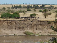 The crossing below was the most dramatic of the ones we witnessed, due to the steep bank that the wildebeest had to navigate in order to enter the water