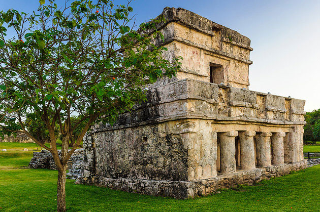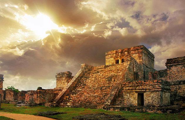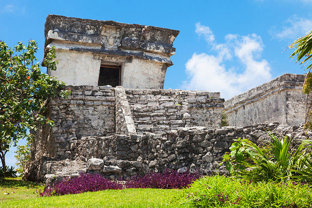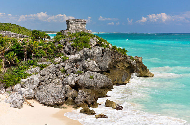 Ancient Tulum, perched on top of a 12-meter-high cliff overlooking the white sandy beaches of the Caribbean Sea, is the only fortified Mayan town by the coast. Bounded on the landward side by a wall, Tulum is one of the most fascinating ruined cities on the Yucatán Peninsula, thanks to its unique cliff-top position and wall paintings. While not much is known of its past, its name is Mayan for fortification, suggesting it once held military significance. Dating from the Maya Late Post-Classic period after AD 1200, the site's most important buildings were probably not erected until 1450, just 68 years before members of a Spanish expedition became the first Europeans to see the fortification. The city appears to have been inhabited right up until 1544, when the Spanish conquered the northeast of Yucatán, and towards the end of the last century, during the Caste War, when Maya Indians again barricaded themselves at Tulum. Perfectly positioned just an hour or so from the resort destinations of Cancún and Playa del Carmen, Tulum is a must-see tourist attraction when visiting the Mayan Riviera.