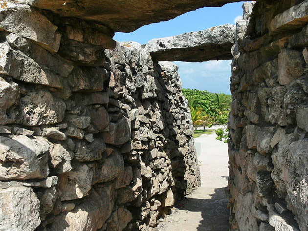 The relatively small area occupied by the ruins of Tulum is surrounded on the landward side by a fortified wall, an enclosed area measuring 380 meters by 65 meters. The stone wall itself was originally between three and five meters high and, on average, seven meters wide and contained five exit points protected by stone slabs - features that suggest Tulum also included a dwelling area. A circular walkway protected by a parapet led along the length of the wall, and at each of the two inner corners was a small temple, also used as watchtowers.