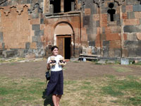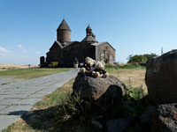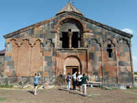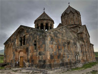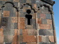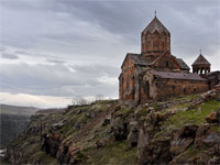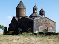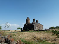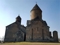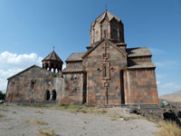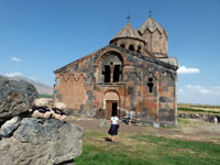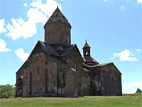Their silhouettes dominate the adjacent villages and rise sharp against the background of the mountains crowned by Mount Aragats. The main structures of the monasteries erected by Prince Vache Vachutyan—the Church of Zion in Saghmosvank (1215) and the Church of Karapet in Hovhannavank (1216-1221)—belong to the same type of cross-winged domed structure with two-floor annexes in all the corners of the building. Subcupola space predominates in the interiors of both churches, which is reflected in the exterior shapes of these structures.