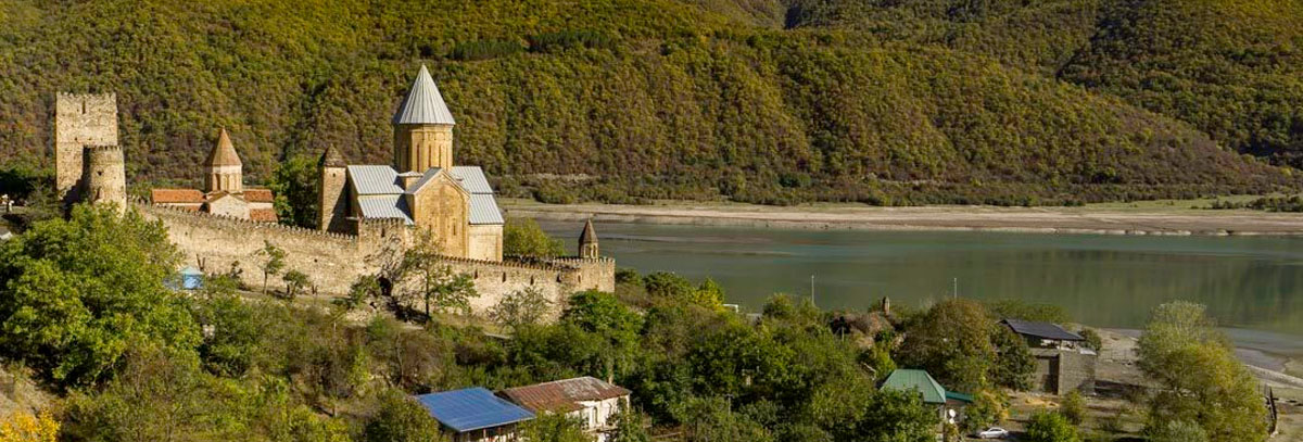 A viaduct leads to the churches and fortress of Ananauri . A UNESCO site which occupies a wonderful location overlooking the Aragvi Valley and Zhinvali Reservoir.