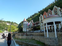 Borjomi is a resort town in south-central Georgia with a population of 10,000. The town is noted for its mineral water industry (which is the number one export of Georgia), the Romanov summer palace in Likani, and the World Wide Fund for Nature-site Borjomi-Kharagauli National Park. It was "old fashioned" in a nice sort of way. We walked up through the gardens and the fun fair (it did not look ecologically themed to me). Had a glass of warm spring water from one source and a glass of cold spring water from another source. There were a lot of people there, mostly Georgian tourists, and we did not see many Western Europeans