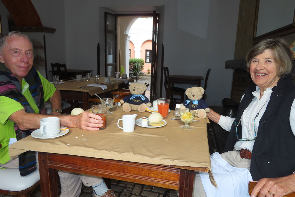 Back at base very soon after 1pm, we read and had a siesta. David was feeling well below par with a bad cold. We met the guide, another David, for our afternoon walk tour at 3:30. But David was not impressed by him and decided to absent himself after 10 minutes. Although the guide David was somewhat weak in his history, Chris then got on quite well with him. She visited several courtyards in colonial houses, one of which housed the processional. floats used during holy week. Another had a large deep footpath in the courtyard, used to refresh their feet after walking round the town, barefoot on the cobbles. It raised the status of a house, if it had its own footbath. Another had a fountain which was also a status symbol as they did not need them to use the town water supply. Then on into the university which was most impressive. Then into Santa Domingo church which had very sturdy structures in it. They finished in a café where Chris tried empanadas And a red fruit granita drink