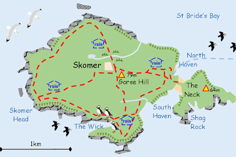 Skomer Island has been designated a National Nature Reserve, Ancient Monument and Full Maritime Nature Reserve. The old name for Skomer Island is Skalmeye –the Isle of the Sword or Cleft/Cloven Isle, possible referring to the island being nearly cut into two.