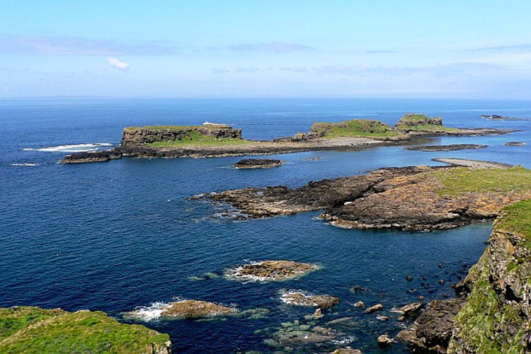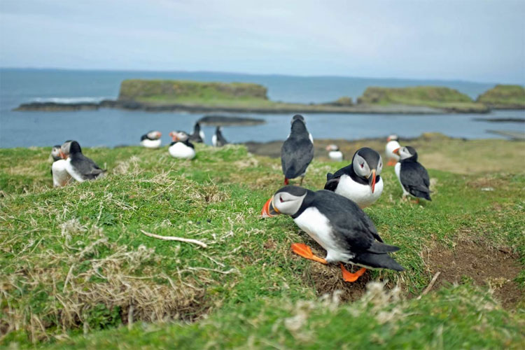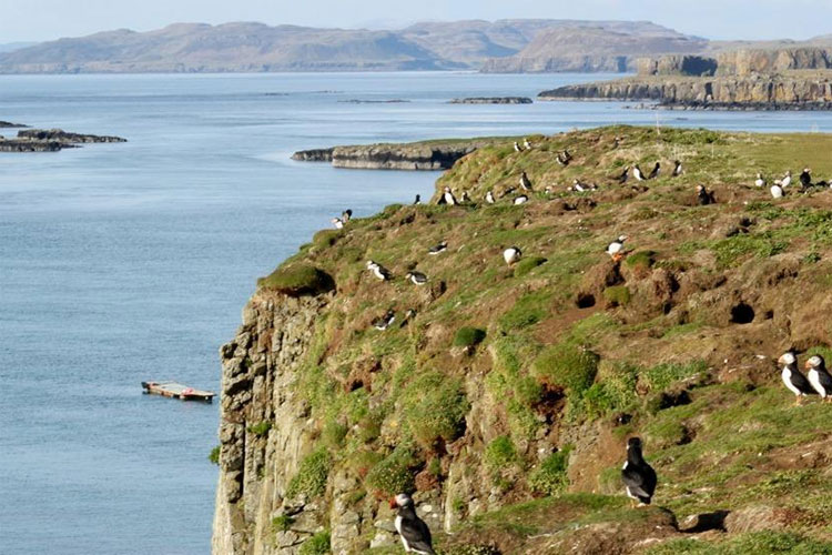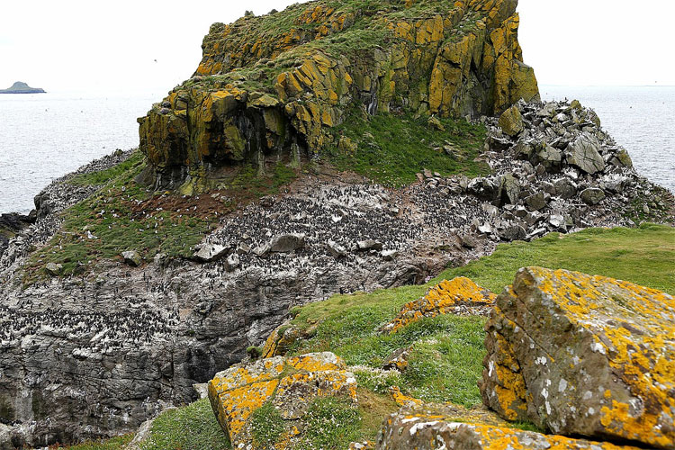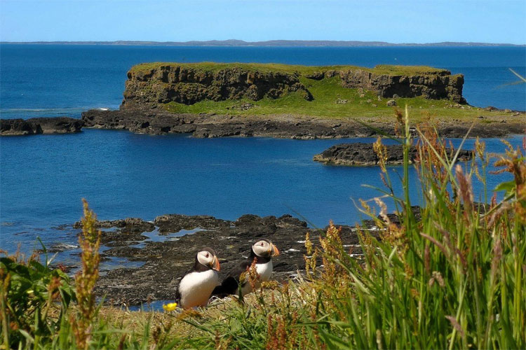 Abundant plant life and exotic birdlife are now the main inhabitants of the area. Fortunate visitors view the magnificent array of birds, especially the great puffins that breed on the islands plateau. One can sit within just a few feet away without disturbing the avian ambassador’s peace. The 81 hectare island is home to many rare and endangered plants such as, primroses and orchids. Views over the landscape and across the ocean can be seen from the 300 foot high cliffs.