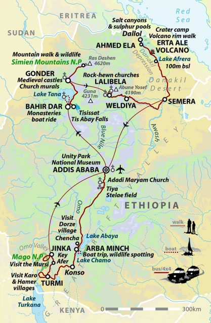 After an overnight flight, touch down in Ethiopia’s capital and hop aboard another flight to Bahir Dar, situated in the north of the country. Upon arrival, enjoy a boat trip across the shimmering waters of Lake Tana and visit the famous monasteries of Ura Kidane Mihret and Azwa Mariam, both of which contain a collection of religious artifacts from the 16th to 18th centuries. You'll also enjoy a trip to the Blue Nile Waterfalls, a 42-metre-high waterfall otherwise known as the ‘great smoke’ in the local Amharic language. Check into Delano Hotel.