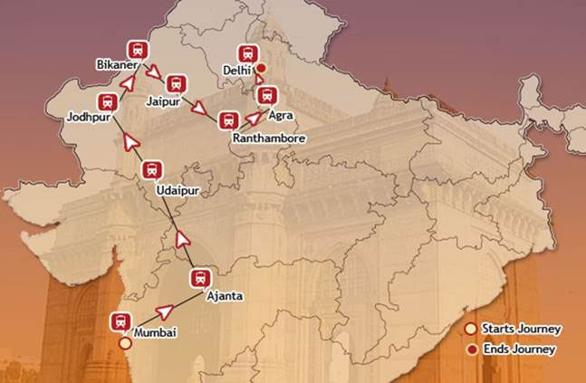 Indian Splendour Maharajas Express : 6 night/7 day tour takes you from the city of Delhi to Mumbai, via the beauty of Agra and Jaipur, Ranthambore, Bikaner, Jodhpur, Udaipur, and Balasinor.