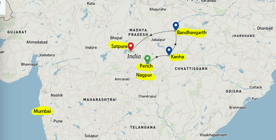 Day 7 KANHA NATIONAL PARK - PENCH NATIONAL PARK Begin the day driving to Pench National Park for another chance to spot wildlife in another one of India's superb tiger parks. Species who call the park home include leopard, porcupine, hyena, and barking deer. There are over 210 species of birds - including peafowl, magpie robin and crimson breasted barbet. Pench Tree Lodge