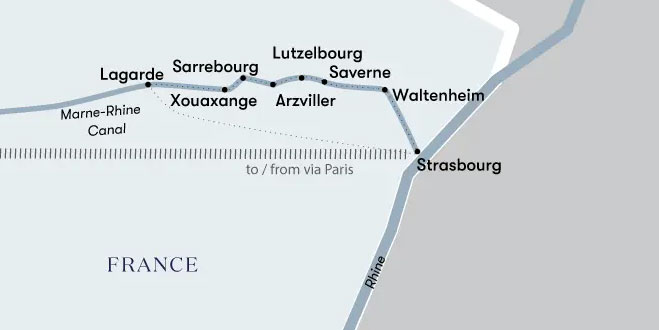 A barge cruise through the rural heart of Alsace. Taking to the water with a maximum of twenty guests, the MS Péniche Madeleine boasts air-conditioned cabins, an elegant dining room, lounge bar, sun deck and terrace, with bicycles for guests’ use when the vessel is moored. As relaxing and refreshing as the landscape it traverses, the barge begins its travels in charismatic Strasbourg, where a small boat cruise lets you see the city by night. Between here and journey’s end, land-based highlights include dinner ashore in canal-side Waltenheim, sightseeing amid the half-timbered houses of Saverne and the nearby Chateau Haut Barr, and climbing the hill to Lutzelbourg’s castle in the Zorn Valley. From here, the canal itself is the star as the barge navigates two tunnels, the unique and ingenious Arzviller Inclined Plane boat lift, replacing a series of 17 locks, and the huge Réchicourt lock; then sails through the lakes to Sarrebourg, to view Chagall’s stained-glass windows, before a gala dinner in its final mooring at charming Lagarde.