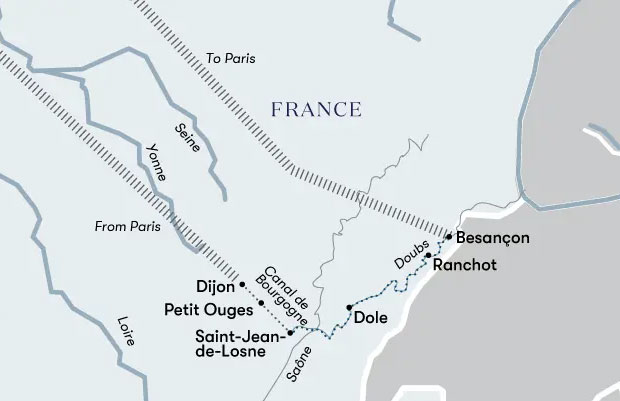 The six-night cruise starts amid the grandeur of Dijon, replete with Gothic and Renaissance architecture; and floats through Burgundy vineyards and beautiful villages, soporific scenery and charismatic cities, to its final port of call at unhurried, uncrowded, undilutedly French Besançon. Between the two, your cruise is aboard the Péniche Danièle, where high standards of service, comfort, and cuisine complement ten well-appointed cabins, a stylish lounge bar and dining room, a sun deck and jacuzzi terrace. Its effortless journey encapsulates the character of Bourgogne, includes wine tasting on the Grand Crus route, and encompasses the ancient and intriguing village of Petit-Ouges; the country’s ‘capital of canal barging’, Saint-Jean-de-Losne; the jumble of juxtaposed eras and architecture in the hillside city of Dole; and the Saline Royale, where precision geometry meets practical purpose.