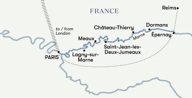 A cruise is aboard the Péniche Déborah, each spacious vessel complete with stylish lounge bar and dining room, sun deck and jacuzzi terrace, and ten well-equipped cabins. The meandering Canal de la Marne teams the tranquillity of its rural journey with the taste of the best Champagnes, and tours of historic towns, on a route from proud landmarks in the heart of Paris to prestigious Champagne houses in Épernay. Constructed in the mid-19th century, it is a delightful fusion of form and function, its first port the ancient city of Lagny-sur-Marne, focused on an abbey and a Jeanne d’Arc legend. Majestic façades meet the water’s edge at Meaux, famed for its episcopal status and for its Brie cheese; while grandeur gives way to a gentler tempo in the tiny rural town of Saint-Jean-les-Deux-Jumeaux and amid the charming streets of Chateau-Thierry, nestled beneath sun-soaked vineyard slopes. Monuments in Dormans mark its cultural heritage; Hautvillers, ‘the Pearl of Champagne’, feeds body and soul with the wines and abbey of Benedictine monk Dom Perignon; and regal Reims trumpets a thousand years of history in a feast of Gothic glory.