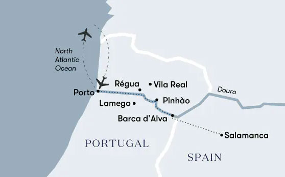 Royal Barge experience. The MV Spirit of Chartwell carried Queen Elizabeth II and Prince Philip in the Diamond Jubilee Pageant on the Thames in 2012. Now this elegant and sophisticated little ship carries a maximum of just thirty guests along the Douro, its sun deck a perfect viewing platform for the river’s remarkable scenery. As it flows through a 2,000 year legacy of winemaking, the river meanders around the sun-soaked slopes of its famous valley vineyards, from which, in times gone by, flat-bottom boats would brave the rapids to carry the wine to the river mouth. Now tamed and shelved with five dams and locks, it is a serene journey from the port wine cellars, bell towers and beaux-art buildings of Porto, to the uppermost Portuguese port on the river, Barca d’Alva, its sleepy quayside lining a lazy bend in the river. In between, we sail beneath the Douro’s seven bridges, cross the Carrapatelo, the highest of the dams, float through super-scenic UNESCO listed landscapes, and go ashore to medieval villages, the Mateus Manor House, port wine tasting at a Quinta, and Lamego’s Moorish castle, museum and holy shrine.