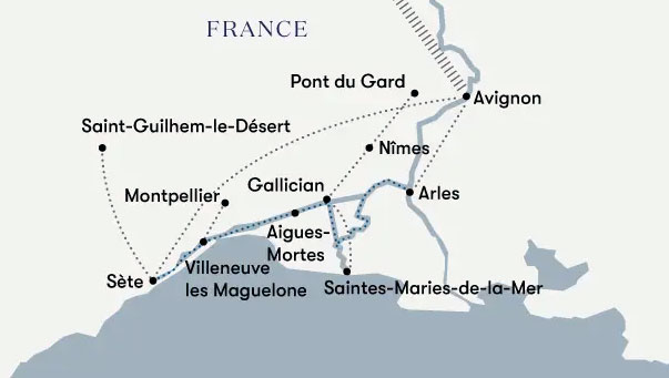 The exclusive MS Péniche Anne-Marie has just ten air-conditioned cabins, an elegant dining room, lounge bar, and sun terrace with jacuzzi, and carries bicycles for guests’ use when the vessel is moored. The 60-mile tour of tranquillity floats from herb-scented hills to medieval towns and Mediterranean beaches along the Canal du Rhône à Sète, a unique waterway which is mostly straight, almost totally at or near sea level and, in parts, parallel with the shore. Beginning on the banks of the Rhône, among the Roman relics of Van Gogh’s old home of Arles, the journey’s westward run leads to the wine cellars of Gallician; the imposing fortified town of Aigues-Mortes, in the heart of the marshlands; through the Camargue to the 7km of sandy beaches at seaside Villeneue les Maguelone; to journey’s end at captivating Sète, criss-crossed with canals; from where we visit the oyster farms of Étang de Thau, and the pilgrimage village of Saint-Guilhem-le-Désert. With excursions enroute, to Pont du Gard, Nîmes, and Montpellier, we conclude with a sightseeing tour in Avignon on the last day.