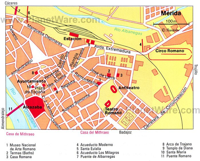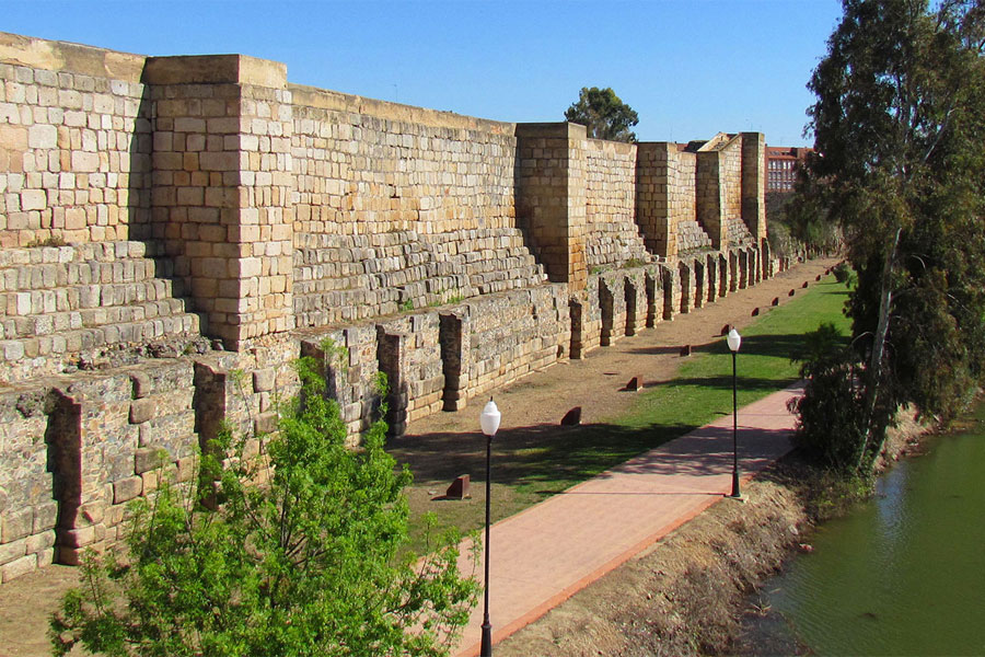 - The Puente Romano, a bridge over the Guadiana River that is still used by pedestrians, and the longest of all existing Roman bridges.Annexed is a fortification (the Alcazaba), built by the Muslim emir Abd ar-Rahman II in 835 on the Roman walls and Roman-Visigothic edifices in the area. The court houses Roman mosaics, while underground is a Visigothic cistern.