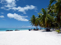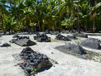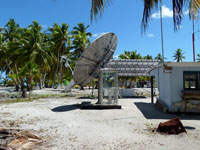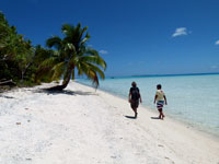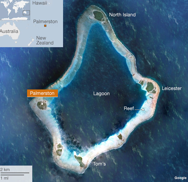 All the islets are wooded with coconut palms, pandanus, and native trees. There is some natural ground water on Palmerston but water captured from rainfall is preferred for drinking. Shellfish inhabit the reef, and fish are abundant although there are concerns about overfishing. The population consists of 62 inhabitants, all but three are described as being descended from an Englishman named William Marsters, thouh this is not true as if an islander marrys anyone from outside Palmerston , the partner becomes an "honarary Marster" when living on the island, giving the impression that they are all Marsters. A recently built telephone station provides the only permanent link to the outside world. The island has no airport or regular air service, and cargo ships only visit a few times a year.