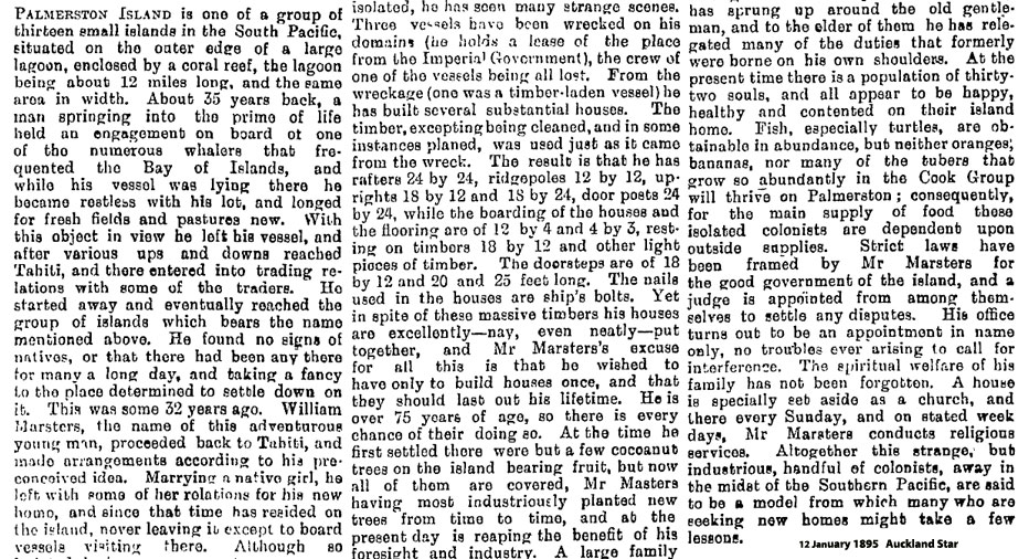 William Marsters, a ship's carpenter and barrel maker, lived in the Cook Islands from the 1850s and in the early 1860s. He was appointed caretaker of Palmerston by its then owner, a British merchant, John Brander. He moved there in 1863 accompanied by his wife, a Polynesian woman, and two of her cousins. He covered the island with palm trees and for the first few years Brander's ships stopped by every six months or so to collect the coconut oil he produced. But then the visits slowed - six months between visits became three years and eventually they stopped altogether. John Brander had died. Marsters was granted possession of Palmerston by Queen Victoria. His wife's cousins became his wives too, and together the three couples had 23 children. Before his death in 1899 he split the island into three parts, one for each of his wives. Thus, Palmerston Island is the only island in the Cook Islands for which English is the native language. William Marsters died of malnutrition in 1899 after his coconut trees were destroyed by blight