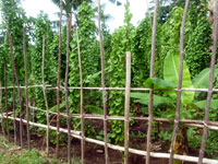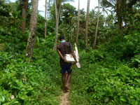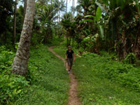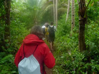 Our task was to get to a village on the othe side of the island. First we had to climb up a 15 m high steep slope of rough limestone to reach the plateau of the Island. Then trough a dense tropical rainforest interspersed with small gardens growing fruits like banana and papaya together with usual staples like taro and yams. The locals cultivated a small area for a few years and then left it alone to regenerate and moved to another small garden field. The soil developed on the reef limestone is not very fertile and the method they use is the only way to survive on this island.
