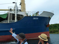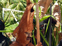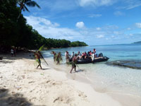 Port Mary, is a small small bay in front of the main village of Ghupuna. The ship could moor in the bay, but first had to navigate a very narrow entrance through the reef. The captain put out two ships officers in zodiacs to mark either side of the entrance, and then was able to sail safely through the gap marked by the zodiacs. Each Zodiac that arrived at the beach landing was greeted by a fierce “welcoming committee”, composed of local men, masked and mud-smeared, dressed in warrior costumes and brandishing spears, shields, and machetes.