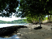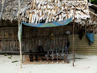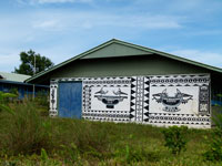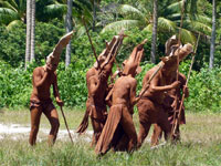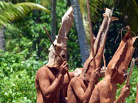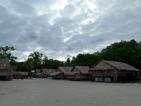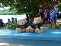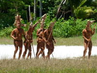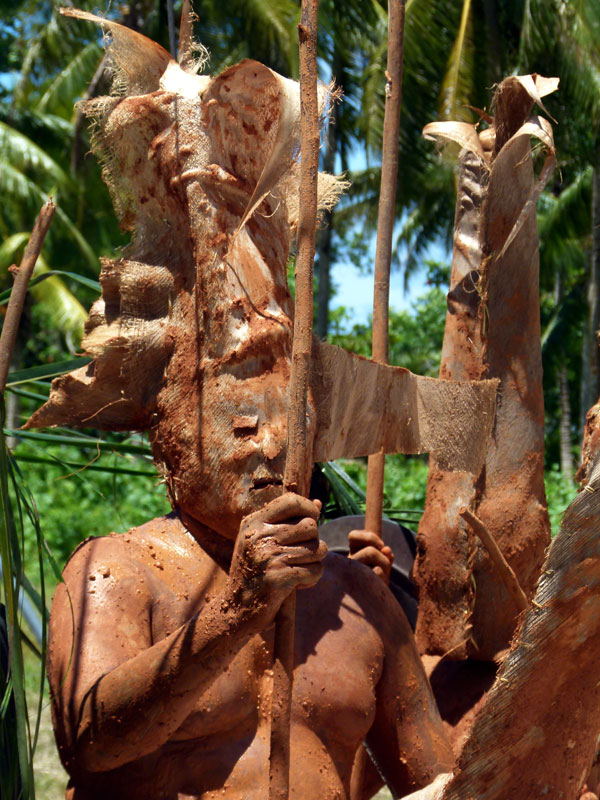 The village had traditional houses built of local timber and leaf. Santa Ana’s leaf houses were built flush to the ground until the 1970s but are now mostly built on stilts. Dozens of curious children greeted us, and we enjoyed a local reception with dances by the island’s "mud men". First we had a very long selection od songs and dances from groups of both men and women, which were, shall we say, average: however the reason for coming here and seeing the dancing is to se the mud men dance. As the women danced, men covered in mud-paint and wearing mud-covered headdresses emerged from the forest and harassed them, caricaturing their dancing and making suggestive sexual motions. These red mud covered characters symbolised the disruptive intervention of white outsiders into traditional life. As they circled the female dancers they were confronted by the arrival of a group of black painted warriors who warded off the intruders and chased them into the surrounding forest leaving the women to complete their dance uninterrupted. Peace was restored. The local children laughed and we all laughed.