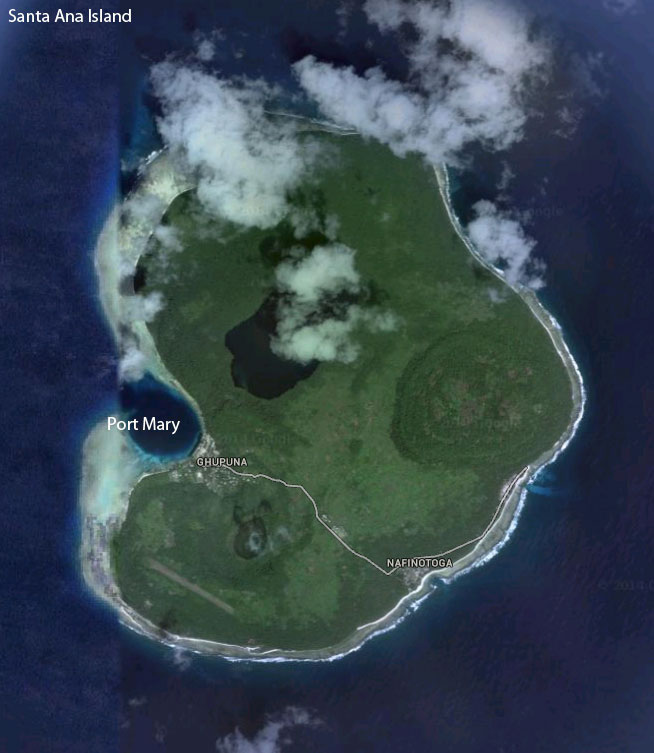 Santa Ana was first by Europeans was by the Spanish expedition of Álvaro de Mendaña in 1568. It is a raised coral atoll 5.6 km long and 4. 5 km wide. The island has two main villages Gupuna (or Ghupuna) and Nafinotoga. The island was visited by Austrian anthropologist and photographer Hugo Bernatzik in 1932. Bernatzik carefully documented daily life among the island people and published an ethnography a few years later. He also took some of the best and earliest photographs of the islanders, reflecting a culture that he deemed was dying in contact with the modern world. During his stay Bernatzik met Heinrich Küper, a German adventurer who lived in Gupuna village. Küper was married to a respectable local woman, Kafagamurirongo, and was the only white who ever reached the arafa (high person) status within a Melanesian community. Küper's grandchildren still live on the island.