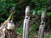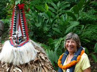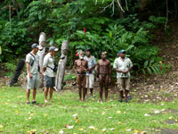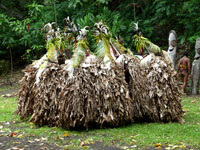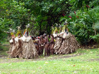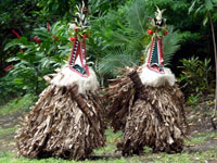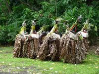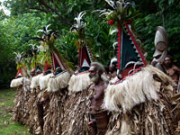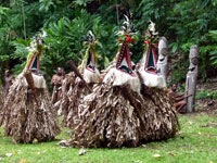 The striking Rom dance is held every year in Northern Ambrym and is followed by a pig-killing ceremony. It is exclusively a male event and kept very secret. The masks which are made specially for this event are superb.The outfits worn for the dance are destroyed immediately it is finished so the spirits won't haunt the dancers. The Rom festival relates to the yam harvest and planting. Yam and taro are food staples in Vanuatu. Today it appears to be a tourist event for us, but none the less spectacular