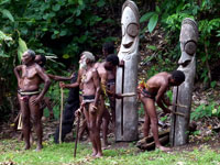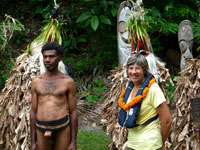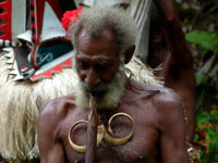 The chief, adorned with the highly valued boar's tusks (used to buy wives) supervises the ceremony. Having eventually reached us, they suddenly broke off and ran away into the jungle