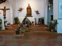 Externally the geometric proportions of this extensive structure are harmonious; particularly the ratio of its height to its overall width and the division made between the main body of the church and its surrounding colonnades. The impressive roof is self supporting on colossal 30 metre high wooden columns; whilst the very thick adobe walls are simply to contain and define the inner space. On the left of the church the free standing wooden bell tower has been restored over the years; but its design has not been significantly modified, and is typical of those that once graced many of the early religious settlements.