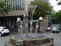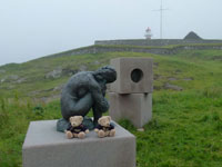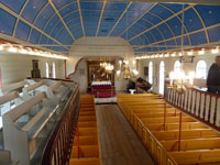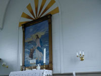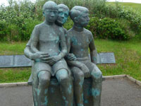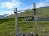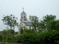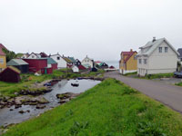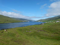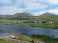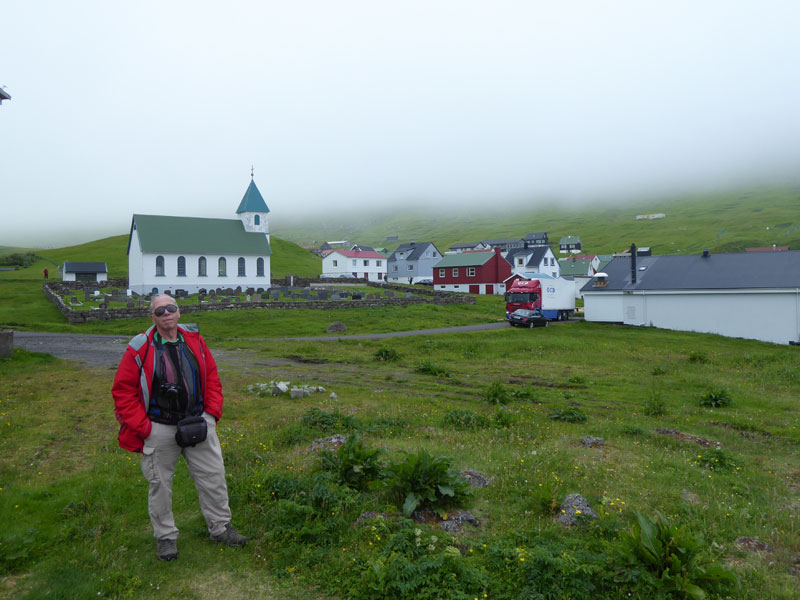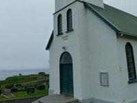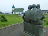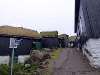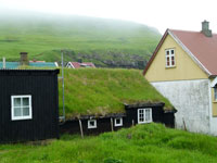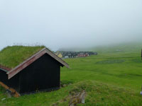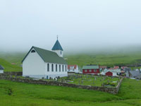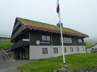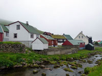 The village church dates from 1929. It was the first one to be consecrated in the village and the first one to feature services in Faroese. Before that, the villagers walked over the mountains to Funningur for church and burial services. On the opposite side of the road a sculpture stands as a memorial to fishermen lost at sea, bearing the names and ages of men from the late nineteenth to the mid twentieth century. The sculpture of a mother and two children looking out to sea was created by Janus Kamban, who has created a number of Faroese commemorative statues. The village school building dates back to 1884. It was built from boulders and was once in use by as many as 50 pupils. Now there are no children. The old village dance hall was renovated and extended in 1986 and now houses a community centre. All houses in the village conform to the prevailing colourful style of building in the Faroes, red, white and green being the predominant colours used. There are still about 50 houses left in the village. Due to the great decrease in population, about half of that number stand empty and are used as holiday homes.