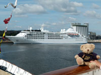 We docked beside the Royal Yacht Britannia in Leith, the port of Edinburgh. The Britannia was right there from our cabin window, and Edinburgh Castle (albeit at telephoto distance) over Chris' shoulder as we had breakfast out on deck