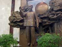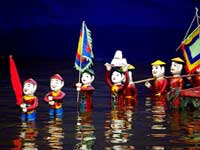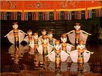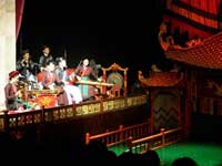 | Back across town in time for the | Water Puppet show. Apart from the fact that an extremely fat American curtailed my view of the stage, it was very good. Water puppetry is a tradition that dates back as far as the 11th century when it originated in the villages of the Red River Delta area of northern Vietnam. The puppets are made out of wood and then lacquered. The shows are performed in a waist-deep pool. A large rod supports the puppet under the water and is used by the puppeteers, who are normally hidden behind a screen, to control them. Thus the puppets appear to be moving over the water. When the rice fields flooded, the villagers would entertain each other using this form of puppet play. | |||